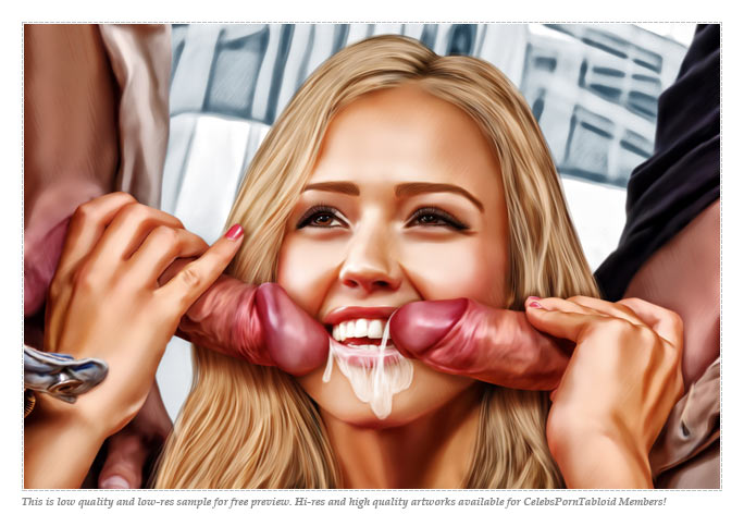 Jennifer Aniston, Angelina Jolie and Jessica Alba two cocks blowjob and hot cum on tremulous lips