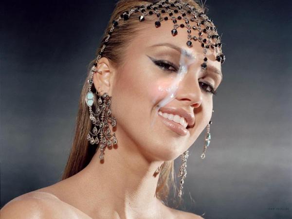 Jessica Alba keeps smiling even when she has a huge load of cum all over her face - she defenetely likes it!