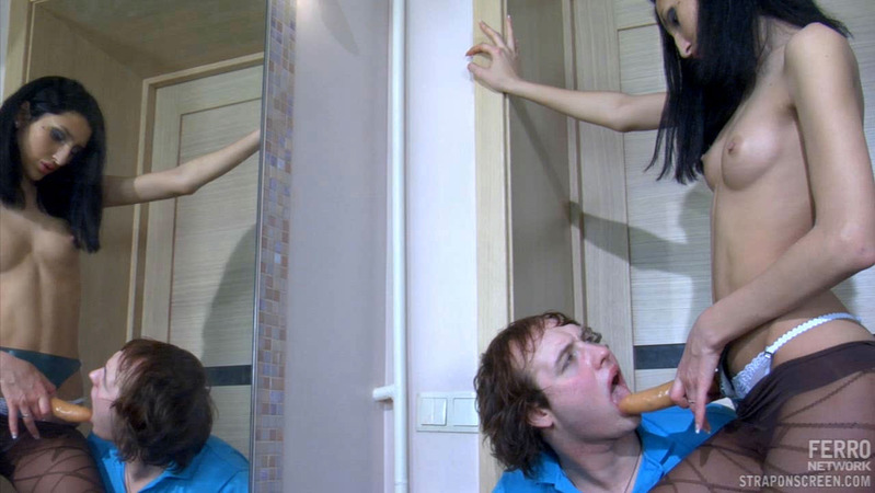 Lustful chick readily spreading a guys butt cheeks with her huge strap-on